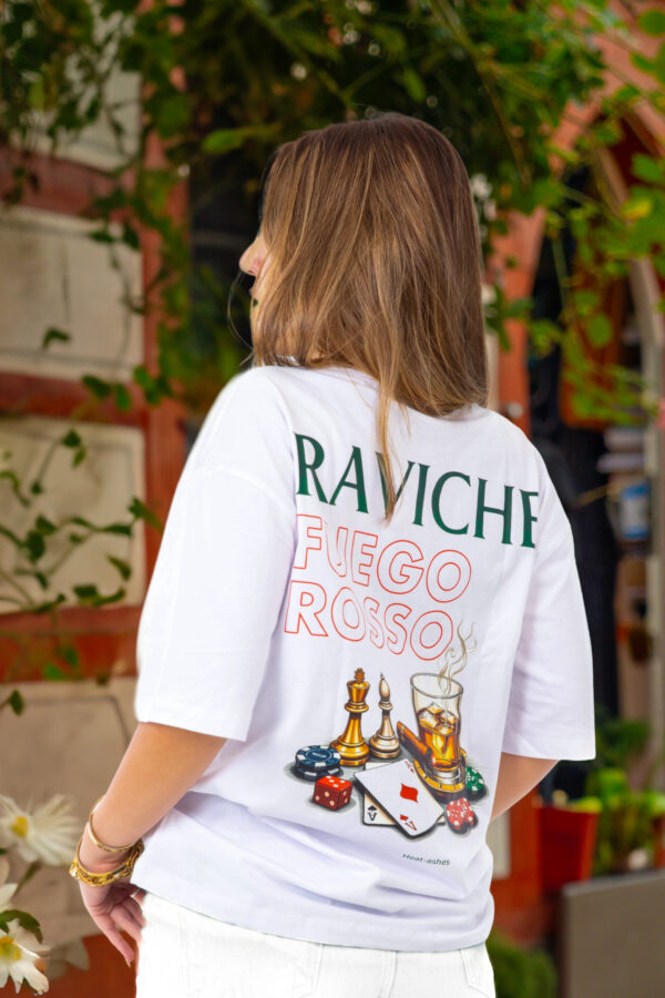 “Raviche Fuego” stands out in sharp white print across the chest, delivering a clean yet powerful statement.