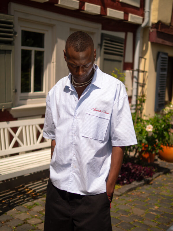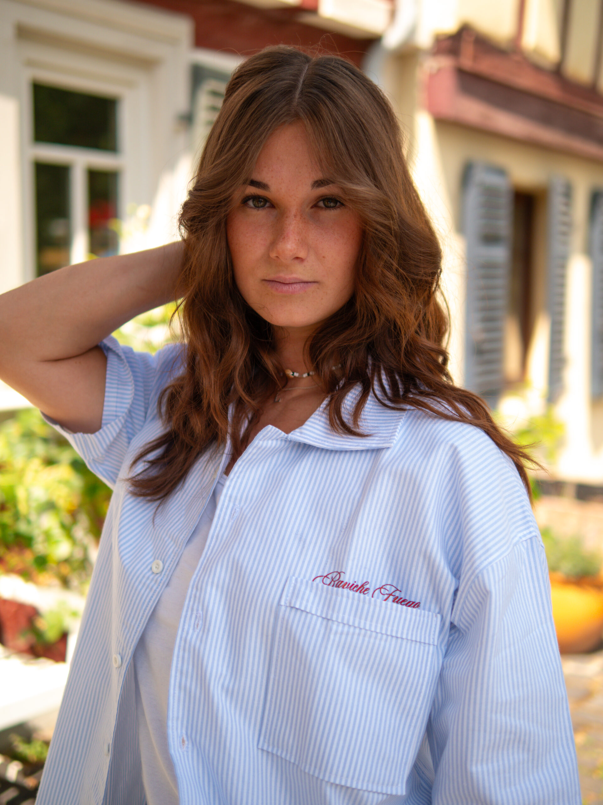 “Raviche Fuego” stands out in vibrant red on bold blue and white stripes, perfect for any occasion.